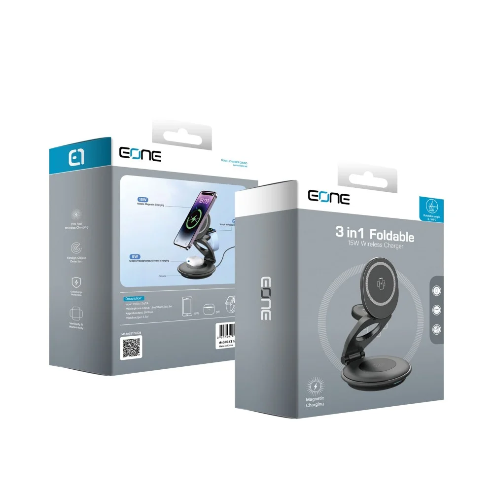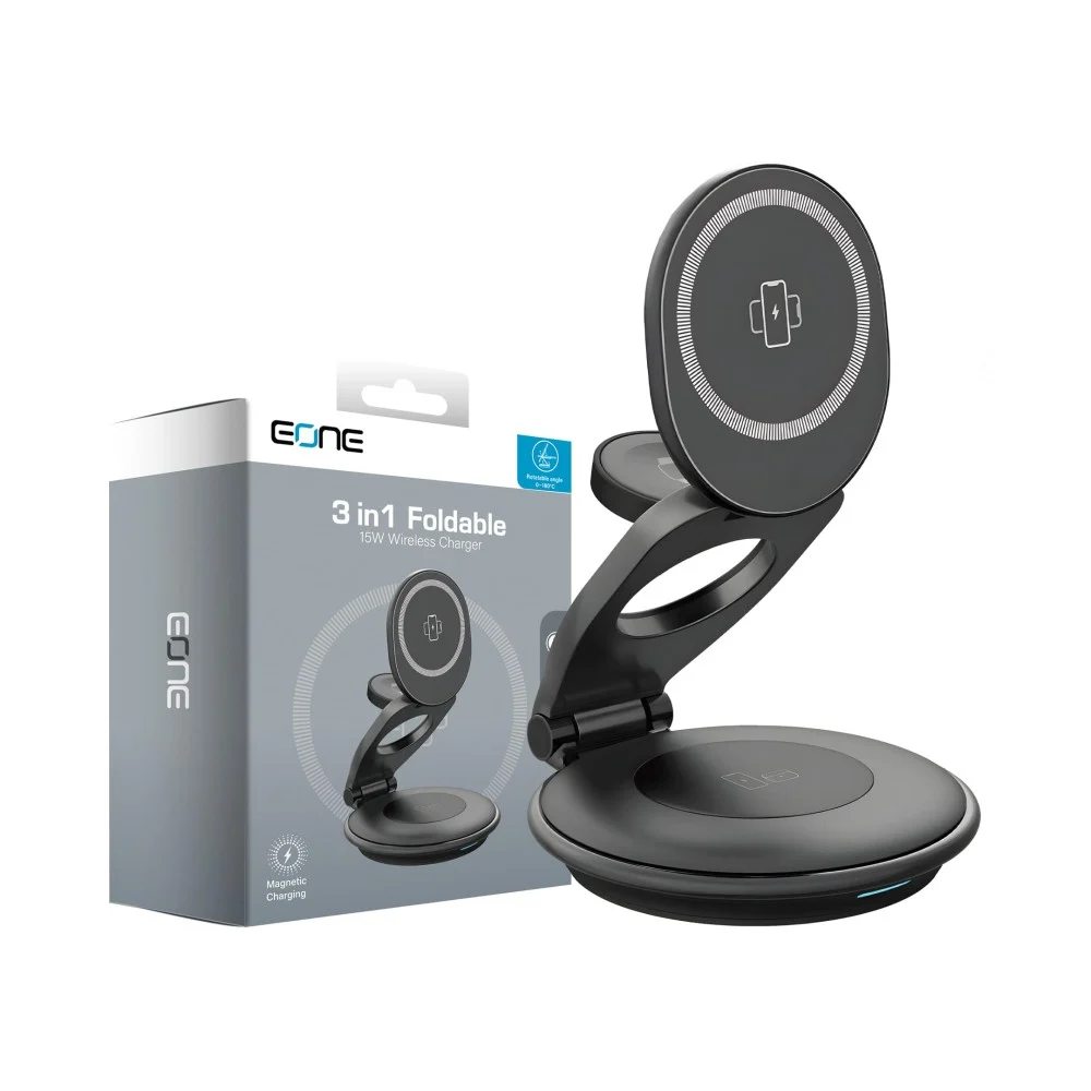 منصة شحن السلكي 3 في 1 بقوة للساعة والسماعة والجوال من شركة اي ون بقوة 15 واط .