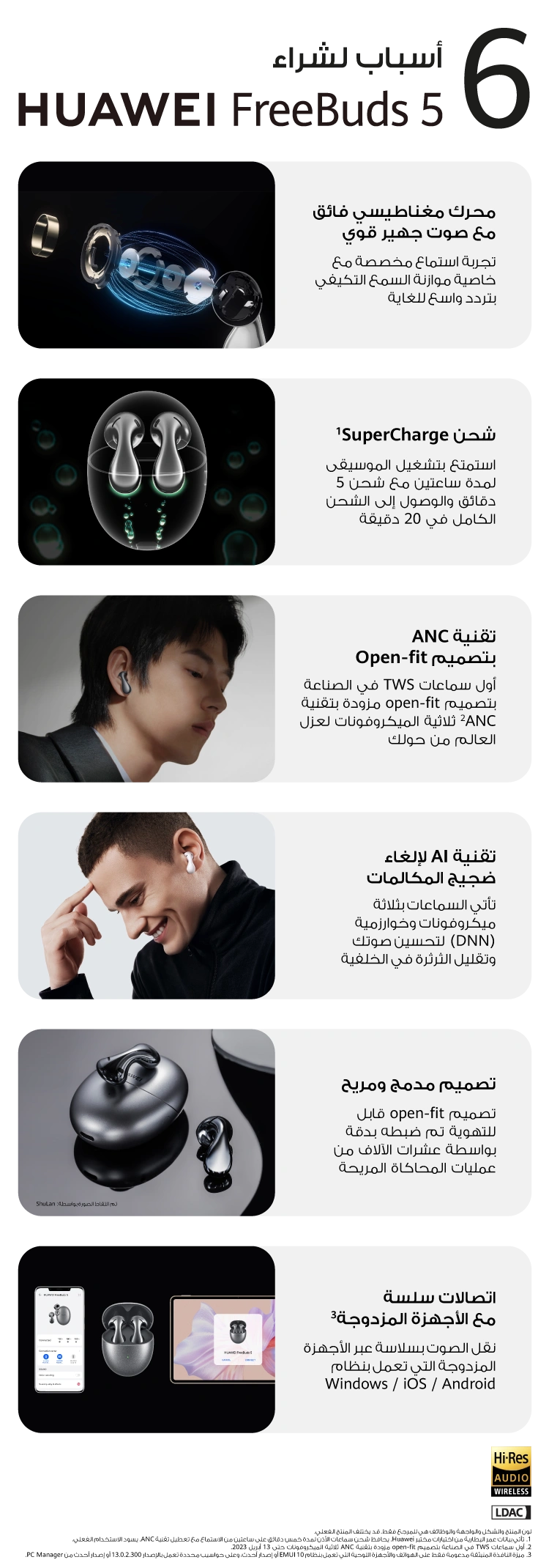 تقوم HUAWEI FreeBuds 5 بضبط الصوت من خلال احتساب الملاءمة وحالة الارتداء ومستوى الصوت - على طول الطريق من 100 هرتز إلى 2000 هرتز - لتوفير تجربة استماع مخصصة مليئة بالعاطفة والإثارة